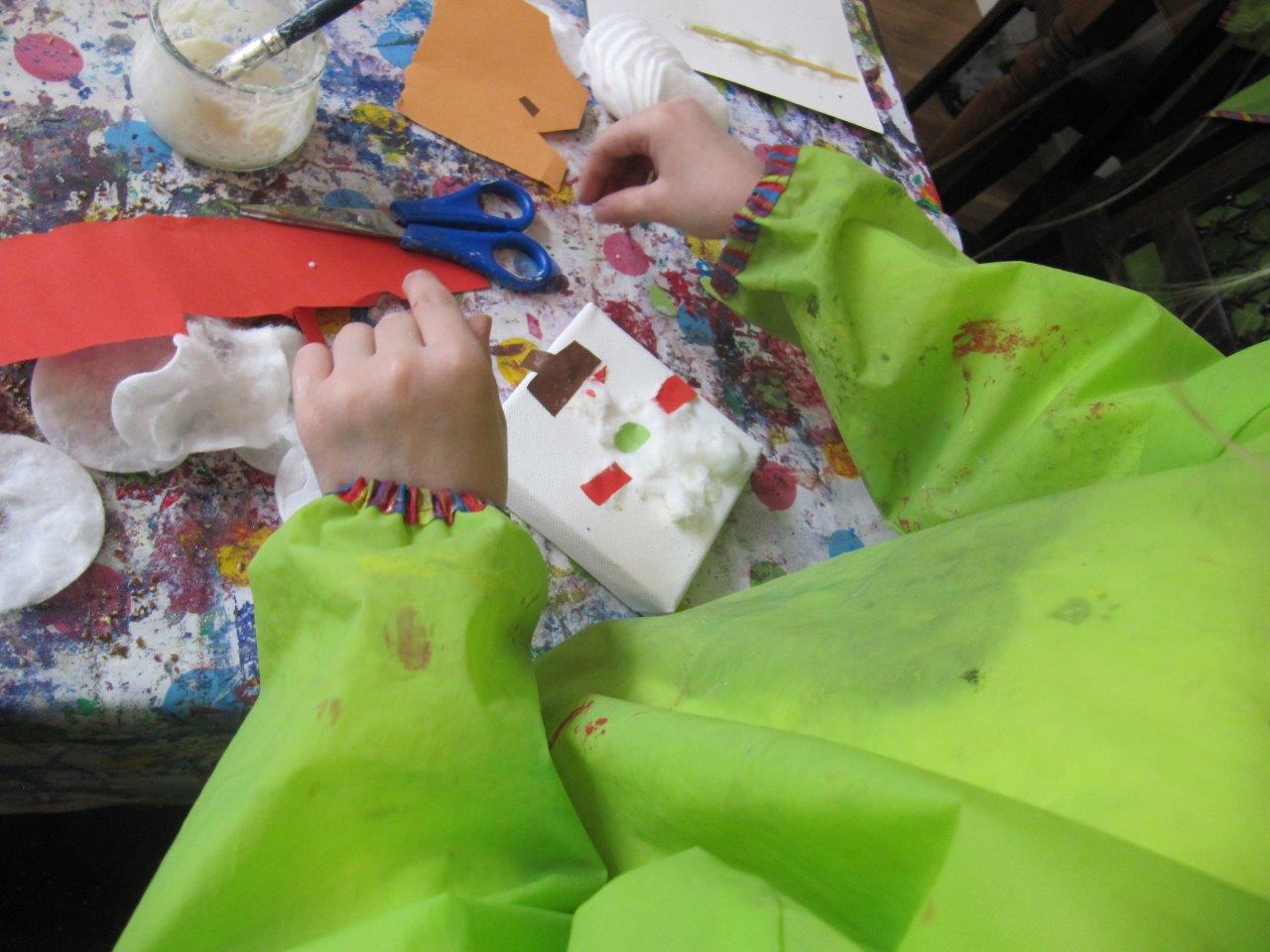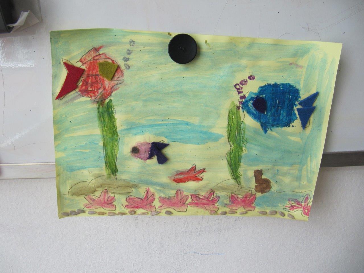 3) Creating an under water world with natural fabric, paints and multi colored paper.